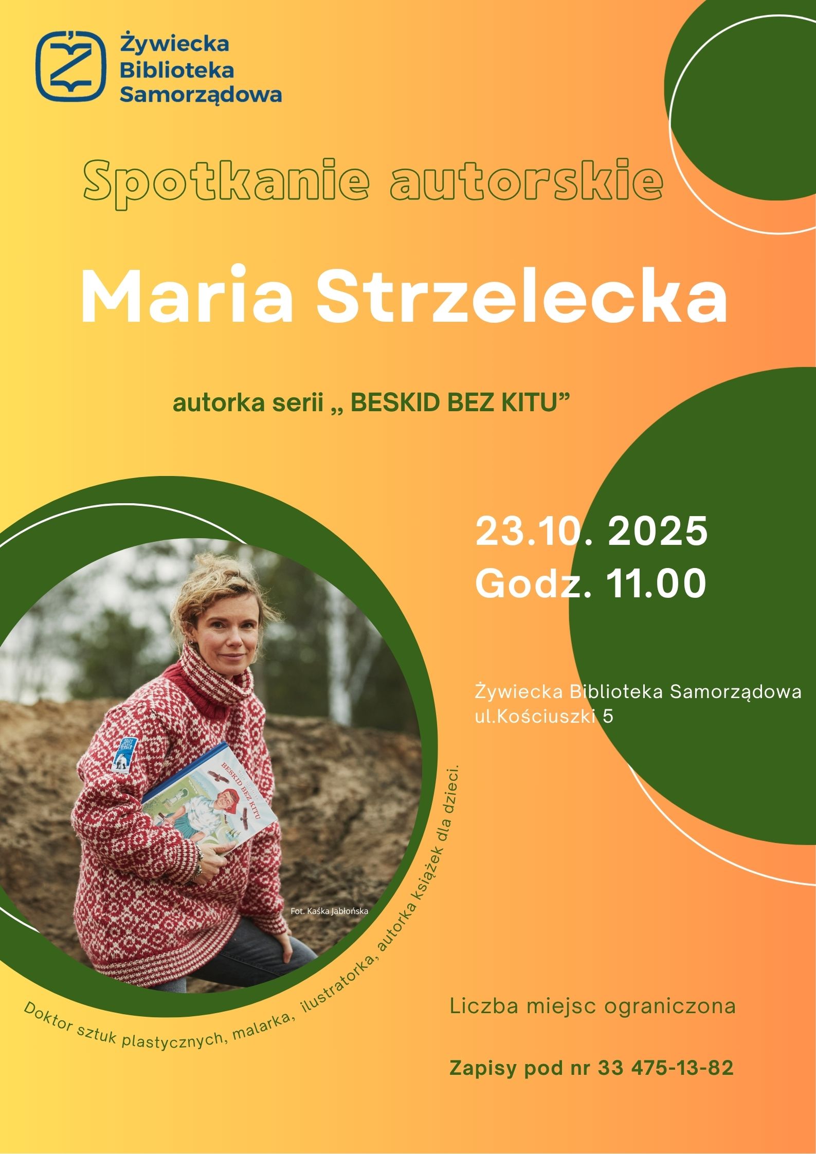23.10/godz. 11.00 spotkanie dla dzieci z Marią Strzelecką, doktorem sztuk plastycznych, malarką, ilustratorką i autorką książek dla dzieci, w tym z serii "Beskid bez kitu" ???? zapisy pod nr ☎️ 33 475 13 82.