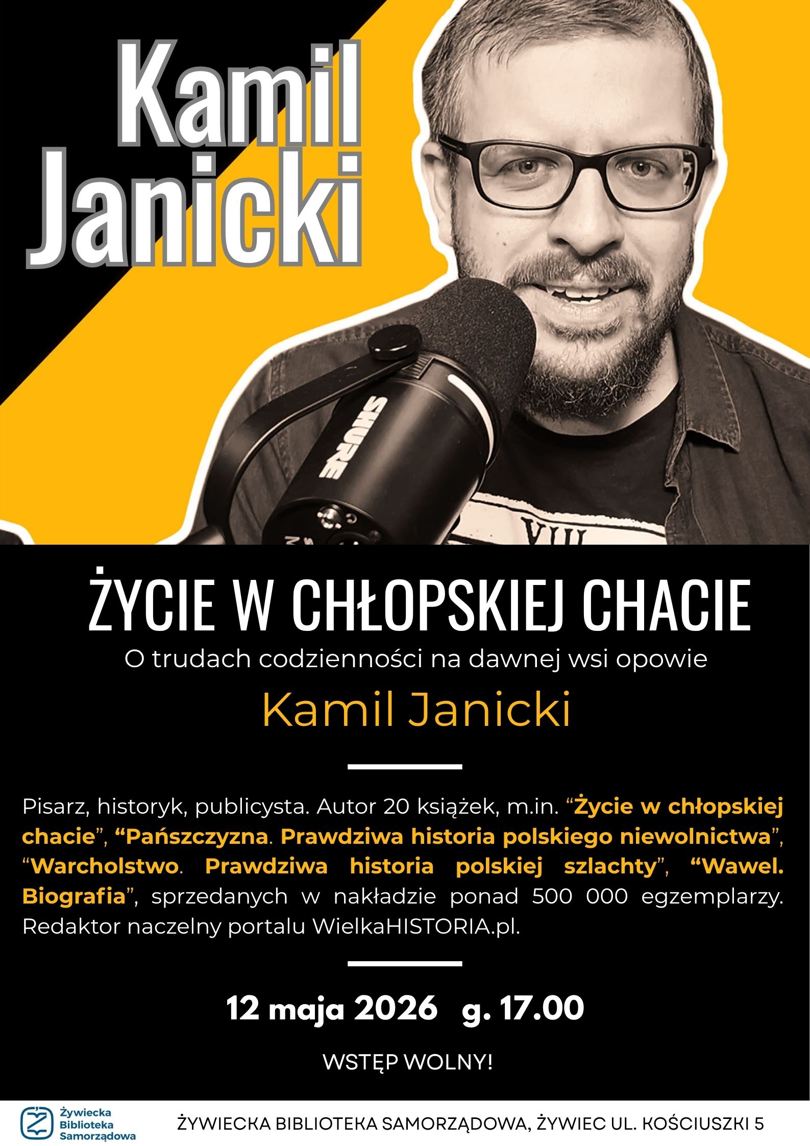 Żywiecka Biblioteka Samorządowa zaprasza na kolejne, interesujące i wciągające wydarzenie ???? spotkanie autorskie z ???? Kamilem Janickim wokół Jego książki pt. : "Życie w chłopskiej chacie".